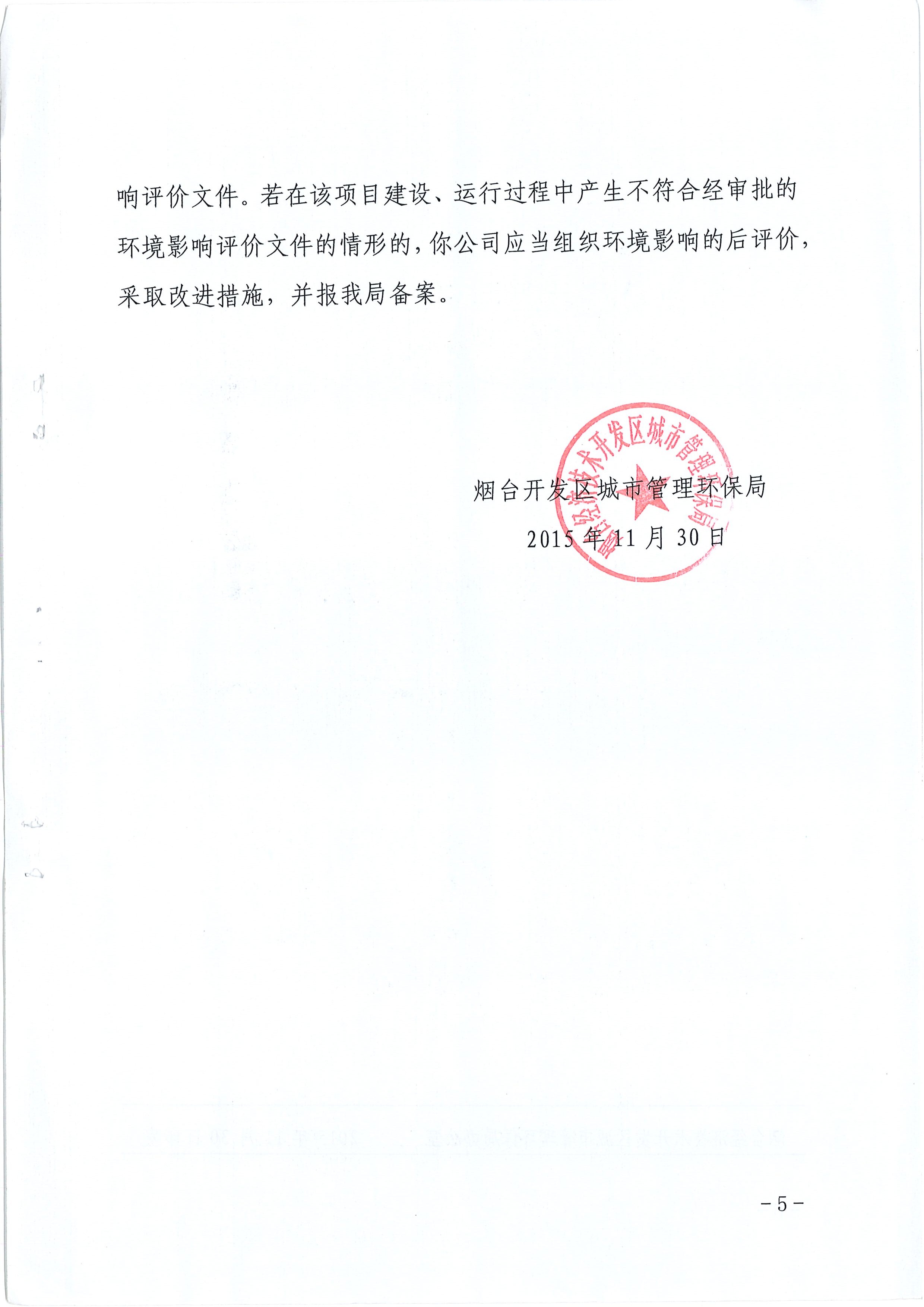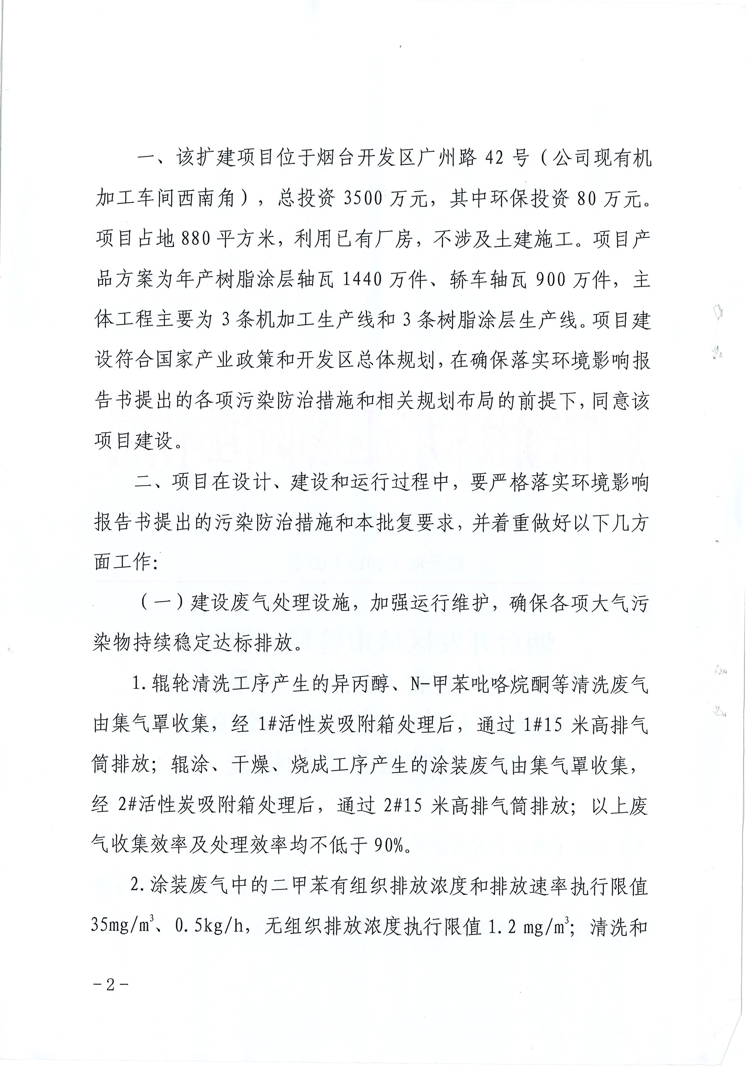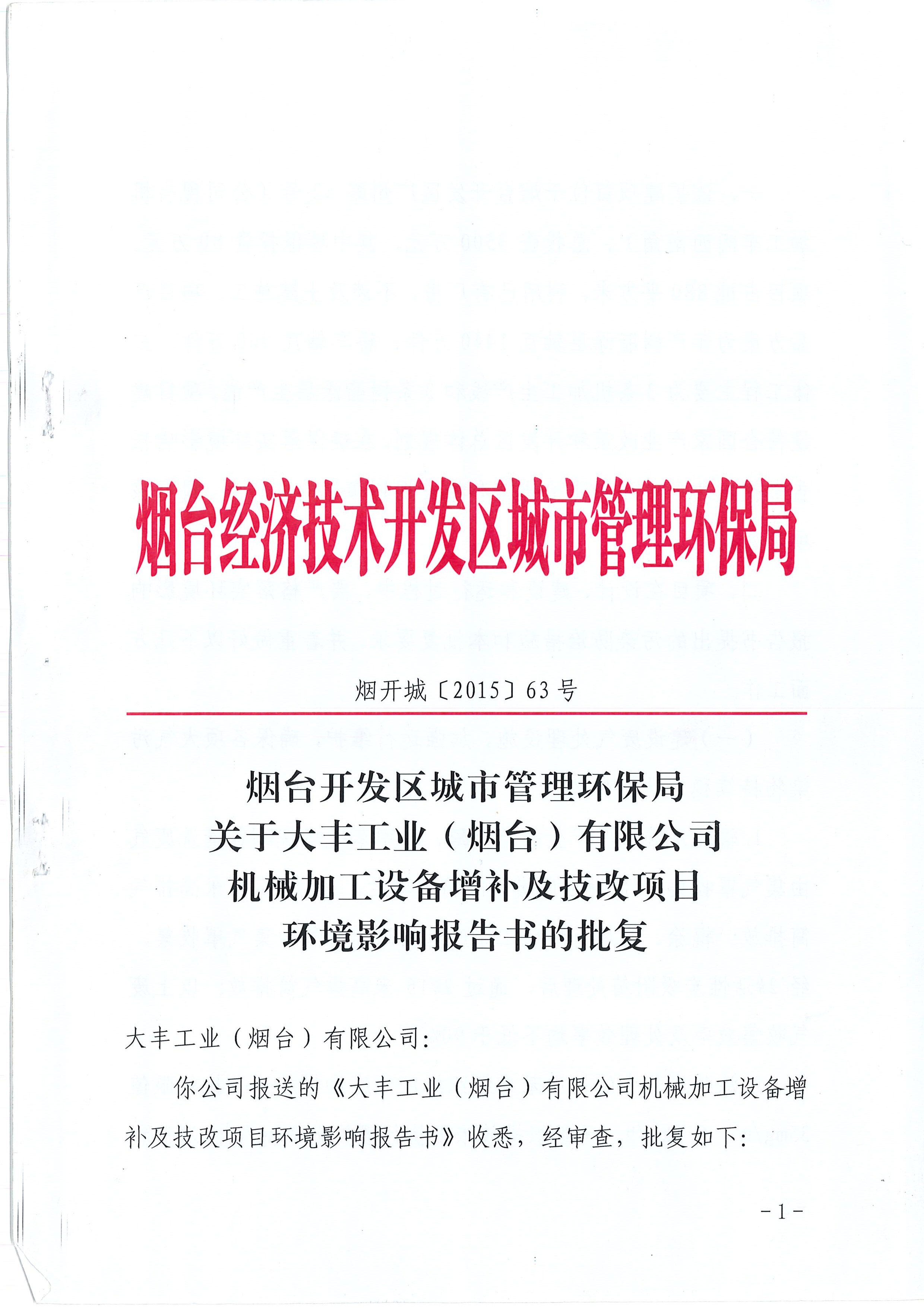 煙臺開發(fā)區(qū)城市管理環(huán)保局關于大豐工業(yè)(煙臺)有限公司機械加工設備增補及技改項目環(huán)境影響報告書的批復