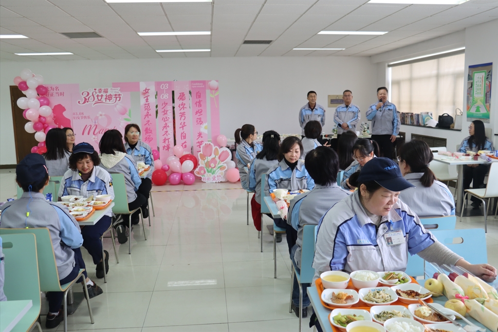 活動伊始,李第一副總經(jīng)理代表公司致辭,充分肯定女職工在崗位上的卓越貢獻,并強調(diào)將持續(xù)優(yōu)化關(guān)愛舉措。毛工會主席為每位女職工送上節(jié)日的祝福,現(xiàn)場洋溢著歡聲笑語。管理部炊事班大顯身手,推出芥末大蝦、魚籽雞翅等創(chuàng)意佳肴,搭配“女神專屬”奶油蛋糕,讓女職工們盡享味蕾盛宴。
