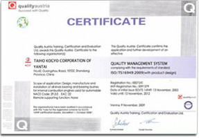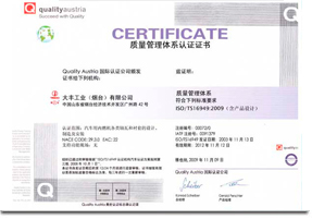為使公司的質量管理水平與國際標準接軌,公司依據ISO/TS16949標準建立的質量保證體系,2003年一次性通過了奧地利OQS公司的認證并取得了認證證書,為國內同行業通過ISO/TS16949體系認證。目前公司質量管理體系的運行充分、適宜、有效,確保了公司的產品質量。